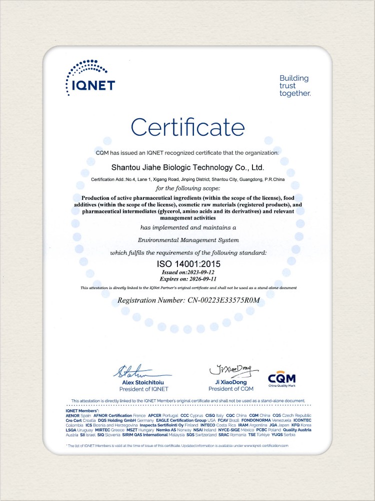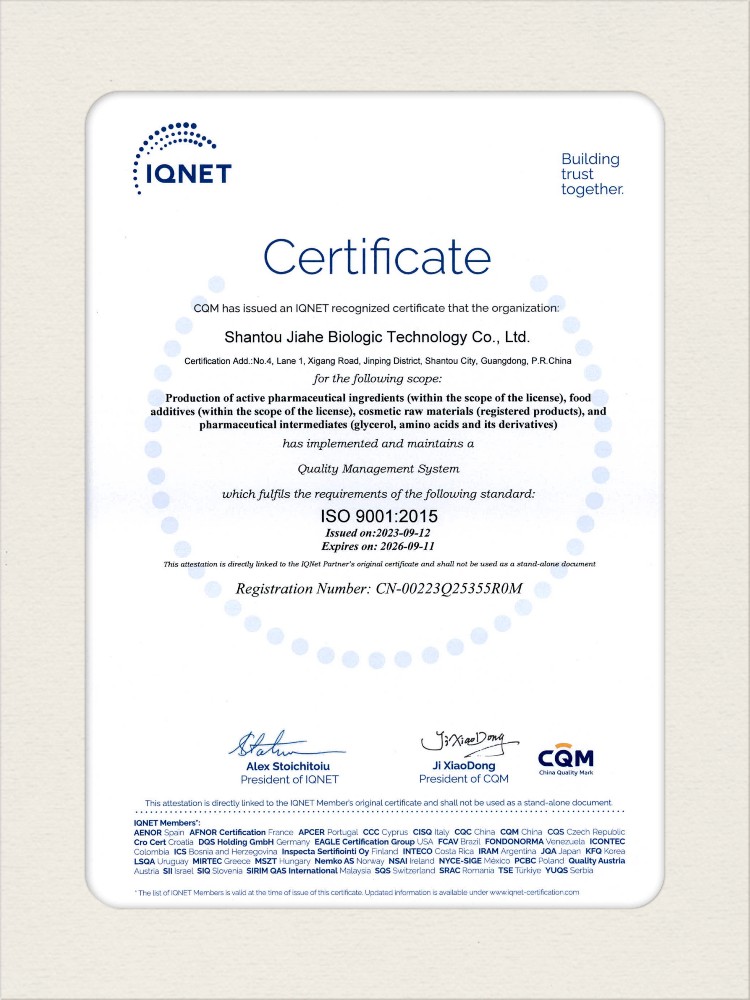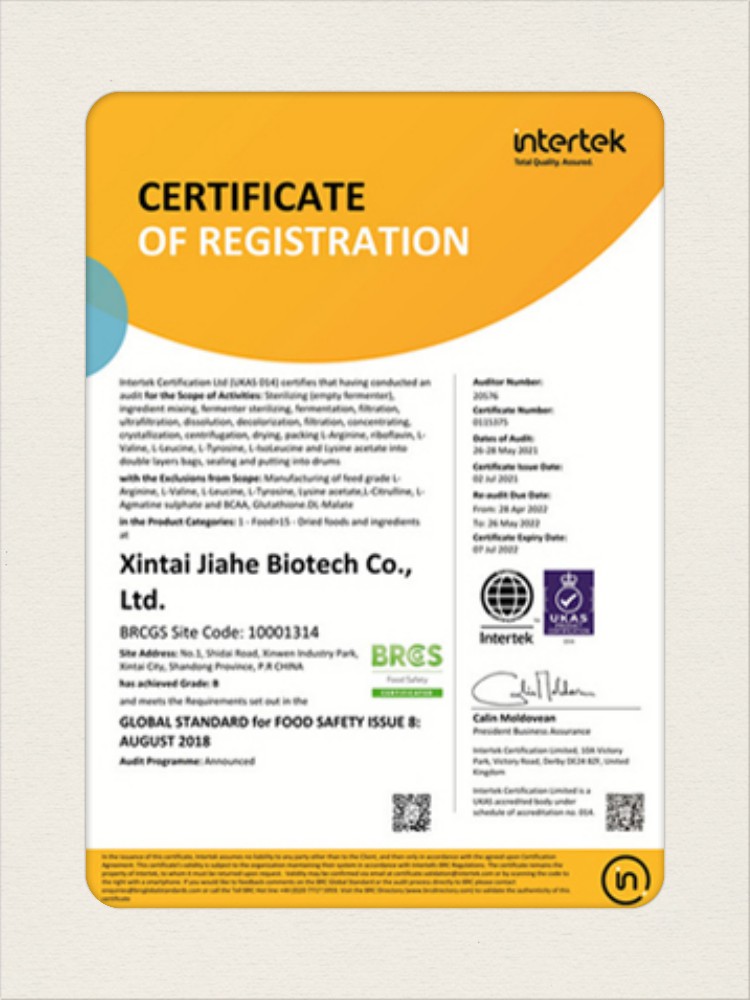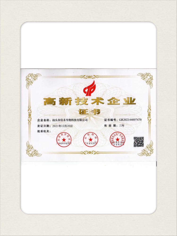 汕頭佳禾生物科技有限公司是一家致力于氨基酸及其衍生物研發(fā)、生產(chǎn)和銷售的國家高新技術(shù)企業(yè),先后通過了國家藥品GMP認(rèn)證,ISO9001質(zhì)量體系認(rèn)證、ISO14001環(huán)境管理體系認(rèn)證。目前,公司擁有“廣東省專精特新中小企業(yè)”、“廣東省氨基酸產(chǎn)品工程技術(shù)研究中心”、“汕頭市生物發(fā)酵工程技術(shù)研究開發(fā)中心”、“汕頭市知識(shí)產(chǎn)權(quán)優(yōu)勢企業(yè)”、“多項(xiàng)國家發(fā)明專利”、“廣東省守合同重信用企業(yè)”等多項(xiàng)資質(zhì)和榮譽(yù),旗下“佳禾牌”系列產(chǎn)品已成為原料藥行業(yè)知名品牌。 新泰市佳禾生物科技有限公司成立于2012年8月,注冊資金2億元,公司位于山東泰安新泰市新汶工業(yè)園區(qū),是國 家級(jí)高新技術(shù)企業(yè)、山東省“專精特新”企業(yè)、山東省制造業(yè)單項(xiàng)冠軍企業(yè)、泰安市科技型中小企業(yè)、泰安市農(nóng)業(yè)產(chǎn)業(yè)化龍頭企業(yè)、中國生物發(fā)酵產(chǎn)業(yè)協(xié)會(huì)理事單位。